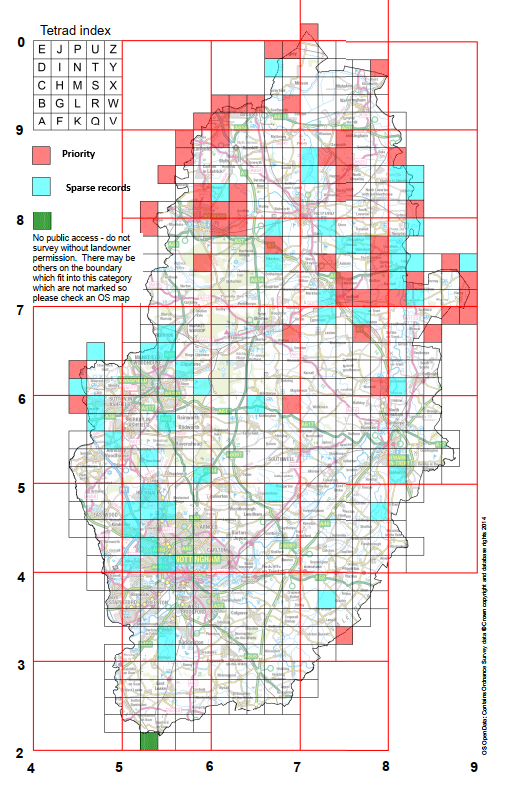 The map to the right shows tetrads (4 square kilometers) covering the county. The red squares are where we need more robust data to reflect the species present. The blue squares could be improved with more records. Our current records may only show the most common species.